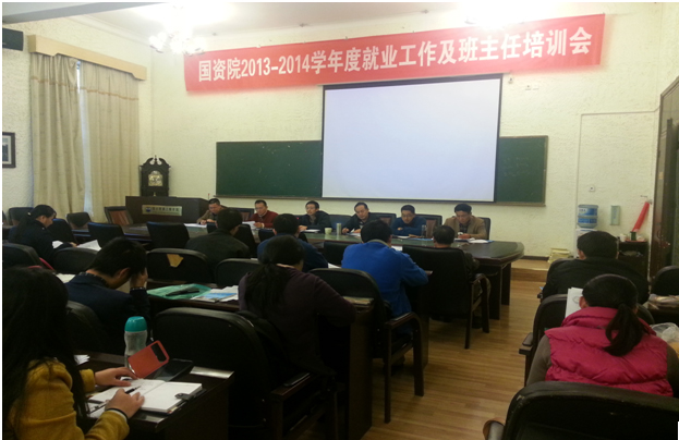2013—2014学年度就业工作及班主任培训大会在学院第一会议室召开。出席会议的人员有院长文书明、党委副书记朱大明、副院长杨溢、李俊、童雄及各系领导班子、所有辅导员和每个专业班级的班主任。会议由学院党委书记李波主持。
