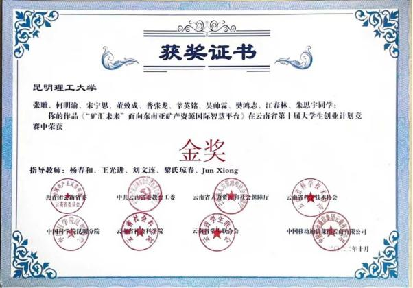 《“矿”惠未来—面向东南亚矿产资源国际智慧平台》获第十三届“挑战杯”中国大学生创业计划竞赛铜奖、云南省第十届大学生创业计划竞赛金奖!