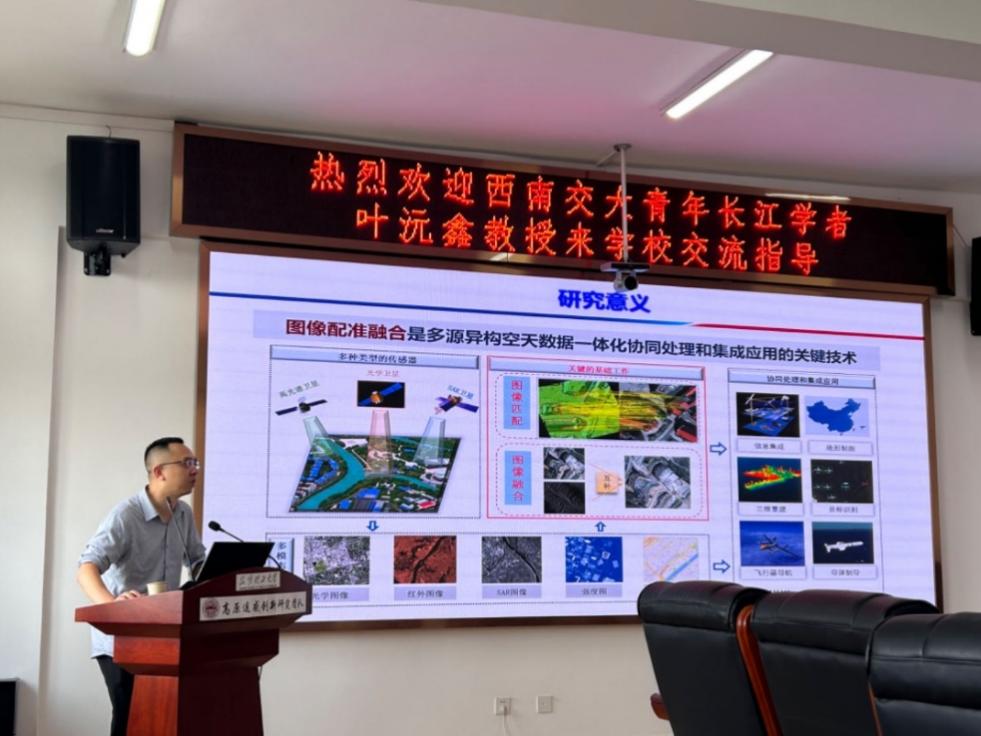 在讲座中,叶沅鑫教授首先为我们介绍了为什么要进行图像配准和融合,并以近年来遥感技术的发展为切入点,讲述了图像配准和融合的重要性。由于成像机理截然不同、地表场景复杂多样,多模态遥感图像间(光学、红外、SAR等)存在显著的差异,造成配准难题:几何畸变和辐射差异;融合难题:互补信息不明确等。针对上述问题,叶沅鑫教授团队经长期研究多模态遥感图像精确配准和融合面临的关键难题,取得了从“多模态不变性特征提取-结构相似性度量-互补信息融合”等系统性成果,从而直接支撑了国产知名商业遥感软件和国防重大型号装备的研制,并服务于全球测图工程和川藏铁路建设等国家重大工程。