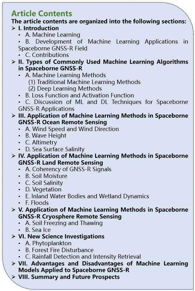 (1)本文系统地回顾和组织了星载GNSS-R领域各种机器学习方法的最新进展,涵盖了这些方法的核心理论、基本原理和数学模型,为机器学习和GNSS-R的交叉提供了全景认知框架。