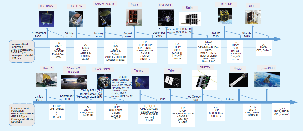 图1. 星载GNSS-R卫星的发展历程和详细信息