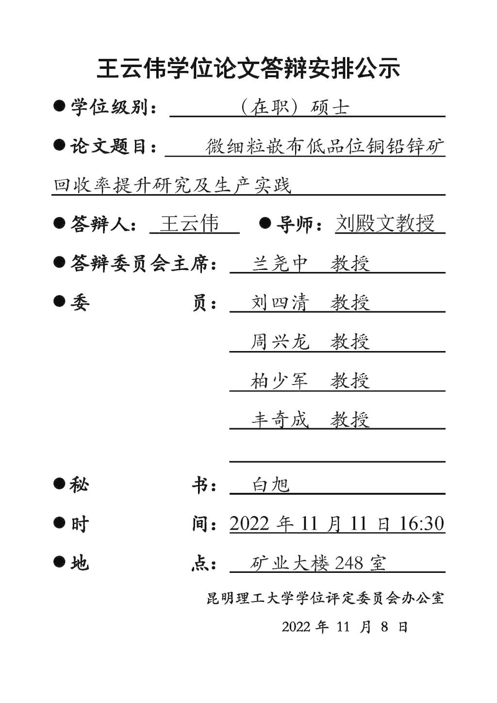 矿加系硕士王云伟学位论文答辩安排公示
