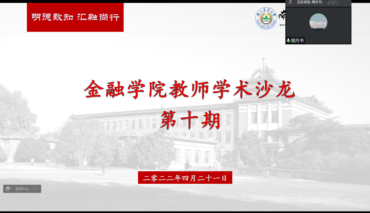 4月21日,金融学院通过在线的方式举办第十期教师学术沙龙。本次活动由金融学院副院长王翌秋教授主持,来自金融系、会计系和投资系的20位老师参加了本次沙龙活动。