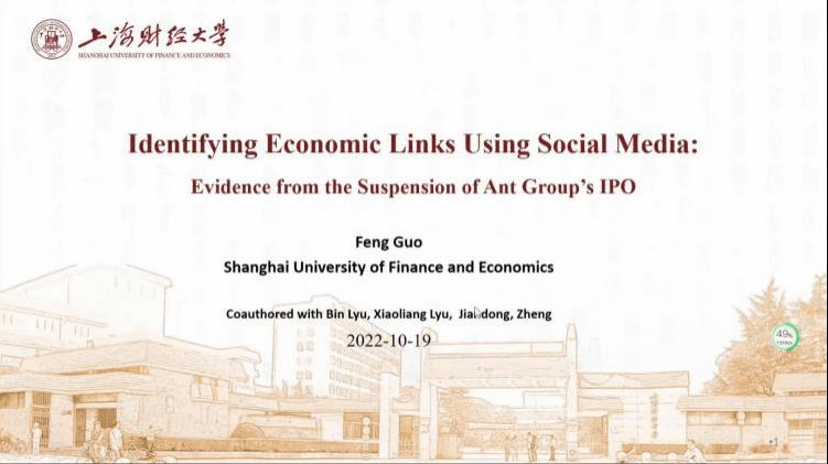 2022年10月19日上午,上海财经大学公共经济与管理学院投资系副教授、博士生导师、北京大学数字金融研究中心特约高级研究员郭峰老师受邀为我院做题为“Identifying Economic Links Using Social Media”的学术报告。报告由金融学院院长张龙耀教授主持,140余名师生参加了此次讲座。