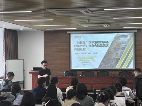 潘老师首先引出“放管服”改革政策落实慢,推进过程有阻力这一现象,现象与理论背离的可能原因在于层级政府间的央地代理问题,从而得出研究的问题:由层级政府间的央地代理问题引发的“放管服”改革执行力差异如何影响微观企业的投资决策?随后,他展示了本文的主要发现以及研究贡献。接着,他从“放管服”改革落地慢的成因以及“放管服”改革执行力如何影响企业实体投资这两方面进行了理论分析和研究假设,采用文本分析法将中央政府的“放管服”改革文件与地方政府的政策文件进行匹配,将文件发布到地方落实的天数作为“放管服”改革执行力的度量指标并进行样本选取和模型搭建。除控制内生性问题外,本文还进行了机制检验、分组研究、拓展性检验和稳健型检验。最后,他得出结论,在“放管服”改革执行力越强的地区,企业的实体投资越活跃;交易成本机制破除了地方官员自行设立的审批事项,破除了头部企业通过游说政府所设立的各种经营障碍;地方政府推动“放管服”改革的动力来自于通过服务企业来获得税收收入而非中央政府的转移支付;企业的金融化水平显著下降,企业的金融资产获利占比显著下降。